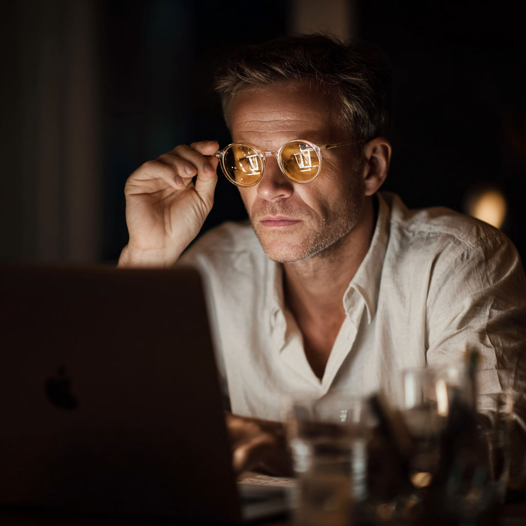 50–78% af brugerne lider af digital øjenbelastning. Briller lindrer trætte øjne og hovedpine efter lang tid foran skærmen.