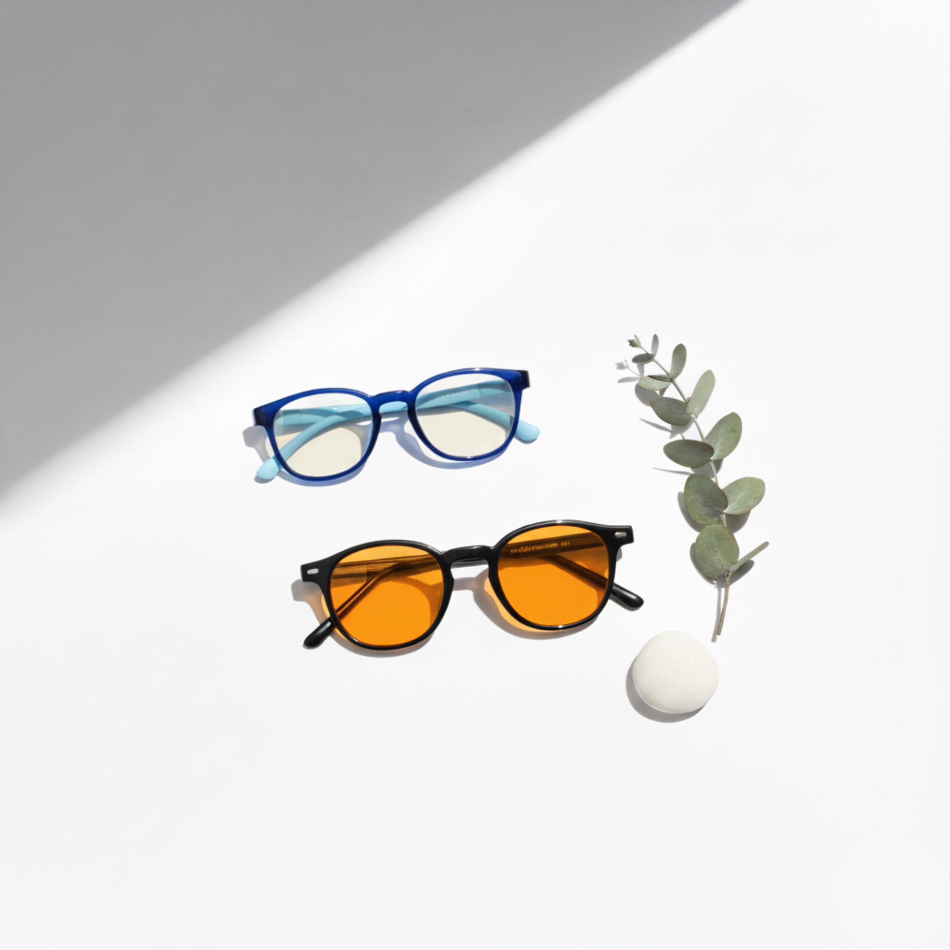 De orange linser er til brug om aftenen og blokerer det meste af det blå lys, så kroppen kan begynde at producere melatonin.