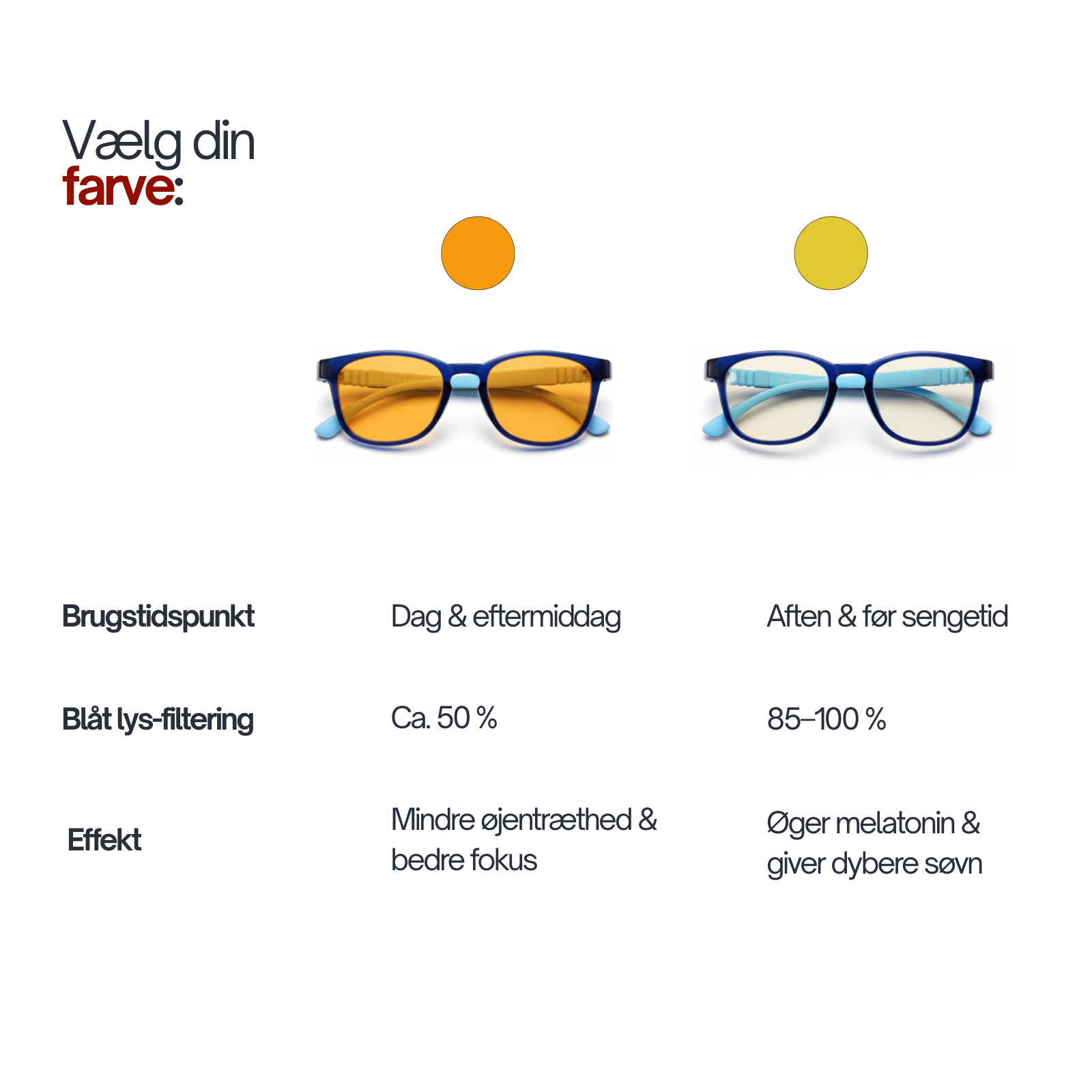 De røde linser er til brug om natten og blokerer 100 % af det blå lys for at give den bedste søvnbeskyttelse.